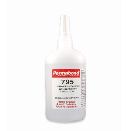 Permabond 795 Cyanoacrylate is a one component, moderate viscosity, fast curing, surface insensitive adhesive that is used for bonding metals, ceramics, plastics, elastomers, wood, fabric, leather, and other porous substrates. It is recommended for high speed production lines, model and jewelry assembly. It is 100% reactive, easy to apply, and minimizes fogging and frosting. 1 lb Bottle.