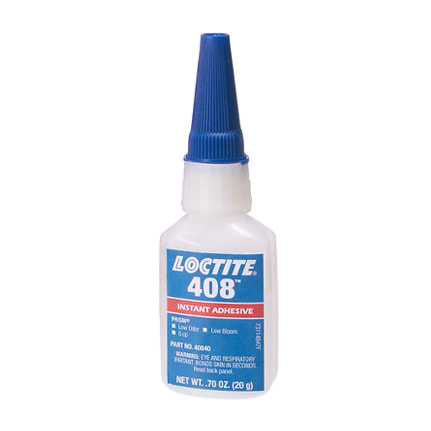 Henkel Loctite Prism 408 is a low viscosity, fast curing, low odor/ low bloom cyanoacrylate adhesive. It is suitable for applications where vapor controls is difficult and for bonding porous or absorbent materials such as wood, paper, leather and fabric. 20 g Bottle.